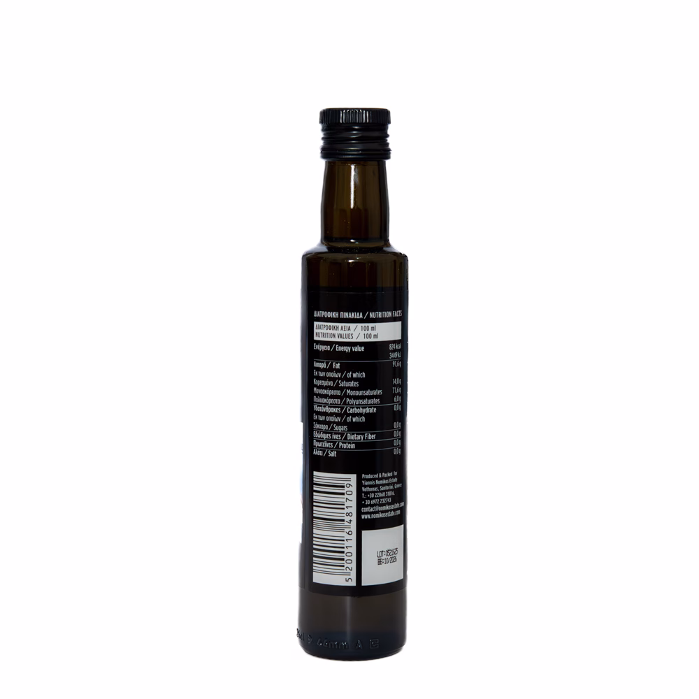 Cultivated in the unique volcanic soil and climate of Santorini, this premium olive oil is made from hand-picked “Koroneiki” and “Agrielia” olives. Cholesterol and sodium free, the olives are pressed within 48 hours of picking to ensure maximum freshness.